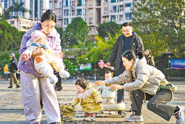 1月6日,南岸區花園路街道南湖社區,家長帶著孩子在廣場上晒太陽。 針對老年人佔比升高、地勢起伏較大等問題,2025年,我市通過在梯坎旁加裝防滑扶手、綠道沿線增設休閑椅等推進社區微改造,積極回應居民訴求,提升了居民幸福感。…