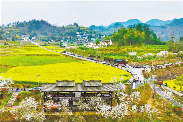 3月14日,黔江區太極鎮李子村金雞壩農業示范園區,油菜花、櫻花、李花競相綻放,吸引不少游人前來賞花游玩(無人機照片)。 近年來,黔江區對流經李子村的太極河流域進行了綜合治理,通過疏浚河道、岸坡整治、水系連通等工程,讓鄉村“河暢、水清、岸綠、景美、人和”。…