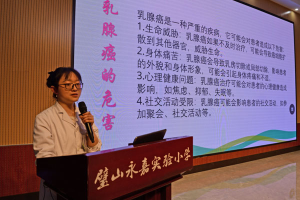 璧山區婦幼保健院乳甲外科醫生蔡禹在永嘉實驗小學開展乳腺癌防治宣講。璧山區婦幼保健院供圖