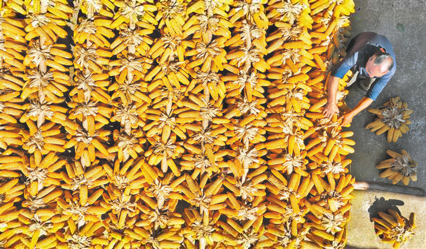 10月11日,黔江區濯水鎮五福村,村民在晾晒玉米(無人機照片)。