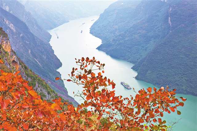 11月22日,船隻航行在紅葉映襯下的長江三峽巫峽段。第十九屆重慶長江三峽(巫山)國際紅葉節於當晚開幕,巫山120萬畝紅葉進入最佳觀賞期。