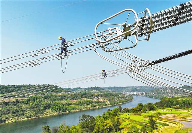 合川區沙魚鎮,哈密—重慶±800千伏特高壓直流輸電工程,運檢員工開展走線驗收。(資料圖片)記者 張錦輝 攝/視覺重慶