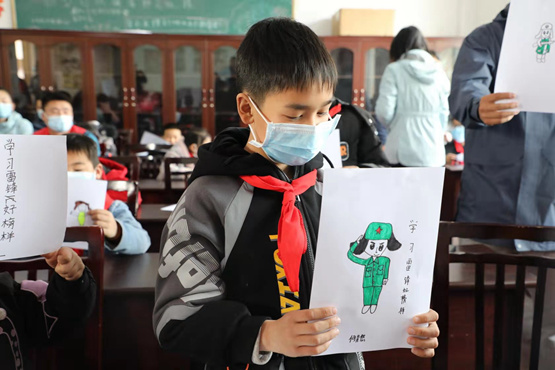 “这是我画的雷锋叔叔,他是解放军所以在敬礼!”小朋友何昊然说。志愿者们通过提问题,讲解PPT,为孩子们讲解了雷锋事迹和雷锋精神,现场让孩子们画出自己心目中的雷锋形象并进行展示。