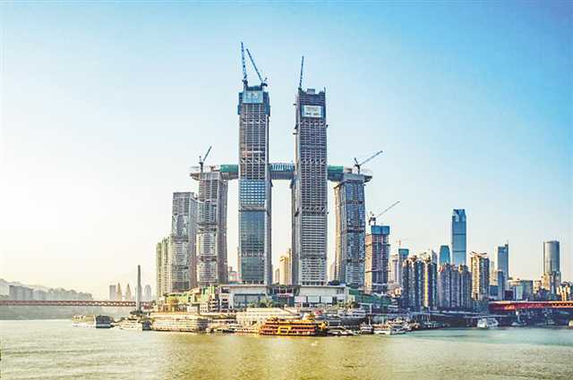 在直线距离3000余公里之外的重庆,朝天门来福士广场建筑群中,4栋高楼顶起一个空中连廊。