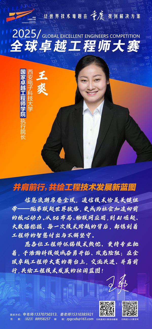 10月15日,西安电子科技大学国家卓越工程师学院执行院长王爽向全球卓越工程师大赛·2025年度发来推介词:信息浪潮席卷全球,通信技术恰是关键纽带——既串联起世界脉络,更成为社会加速向前的核心动力。从5G布局、物联网应用,到AI崛起、大数据挖掘,每一次技术跨越的背后,都镌刻着工程师的智慧付出与不懈坚守。愿各位工程师怀揣技术热忱、秉持专业执着,于浩瀚科技领域奋勇开拓、攻克险阻;在全球卓越工程师大赛的舞台上,以交流促共进、以并肩赴新程,共绘工程技术发展的壮阔蓝图!